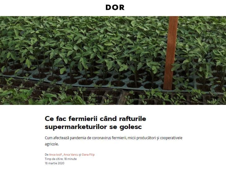 Multumim, Decât o Revistă . Cum afectează pandemia de coronavirus fermierii, micii producători și cooperativele agricole. Pentru cei care trăiesc din agricultură, fie că sunt afaceri de familie, food huburi sau cooperative, munca nu se poate opri. Pentru ei, măsurile împotriva infectării cu coronavirus presupun o mai bună planificare a drumurilor pentru aprovizionare, mai puține mâini prin care trec legumele, mai multe comenzi online și mai puțină vânzare în piață. Despre ei si despre Roade si Merinde in articolul celor de la Decat o Revista aici. https://www.dor.ro/cum-se-schimba-economia-rurala-in-vremea-pandemiei/?fbclid=IwAR3KJR8yQ7GPC5xx89H2qmcSfMSWJirt3x6KPVlQtYDMEDUy7vc5I-5iw14